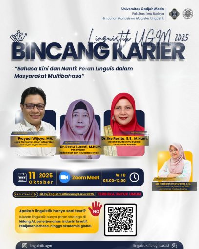 The common stereotypes surrounding linguistics are the vast volume of evolving theories and specialized scholarly discourse. However, Bincang Karier Linguistik UGM 2025 has demonstrated that linguistic contributions to society extend beyond academic subjects. Hosted by Siti Radibah Imatufariq, Linguistics Master’s Program, Faculty of Cultural Sciences, Universitas Gadjah Mada, invited three alumni across different fields to share their journeys and experiences working in multilingual societies.